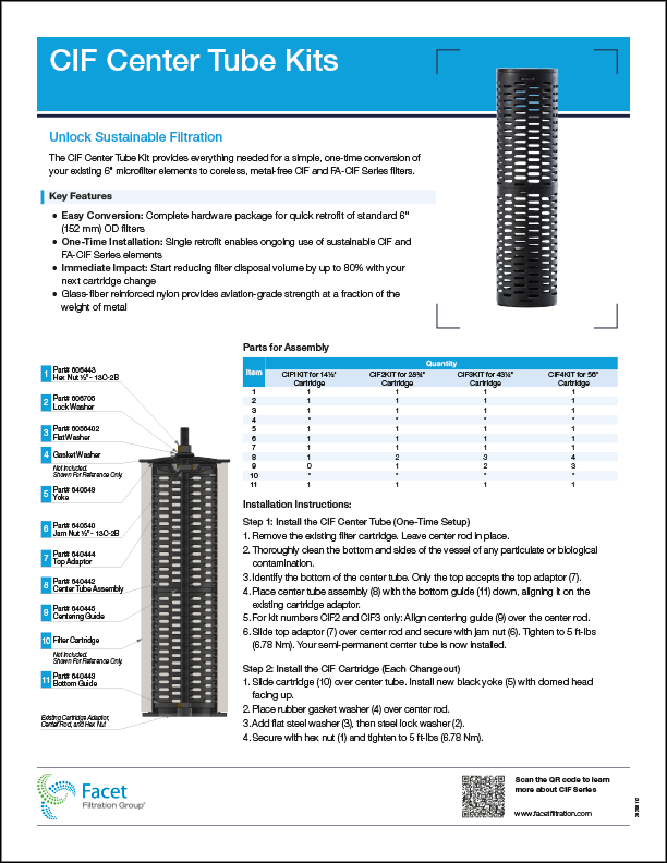 With the CIF Center Tube Kit, retrofitting is simple. The kit provides everything needed for a simple one-time conversion of existing microfilter elements to FA-CIF elements. It’s designed for seamless integration with your existing infrastructure—no major modifications, no extended downtime, no complicated conversions.